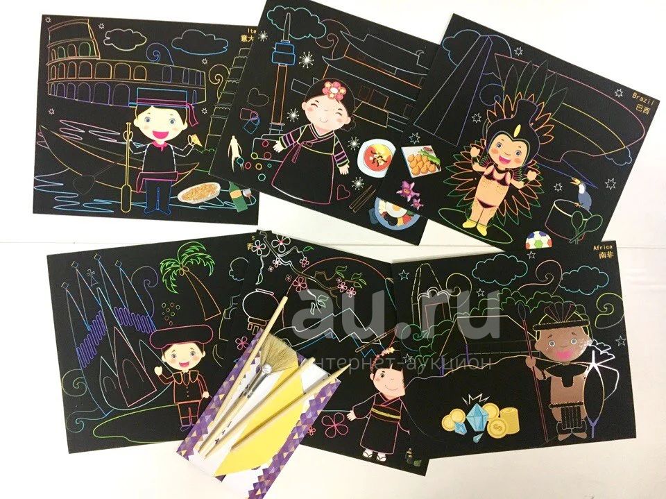 Новый вид творческих занятий для детей и взрослых. В помощью специальных палочек, рисунок процарапывается на черной поверхности и вы создаете яркий неповторимый рисунок - можно рисовать разные линии и фигуры, а можно процарапать каждый миллиметр и тогда вы сможете увидеть яркий элемент рисунка во всей его красе.