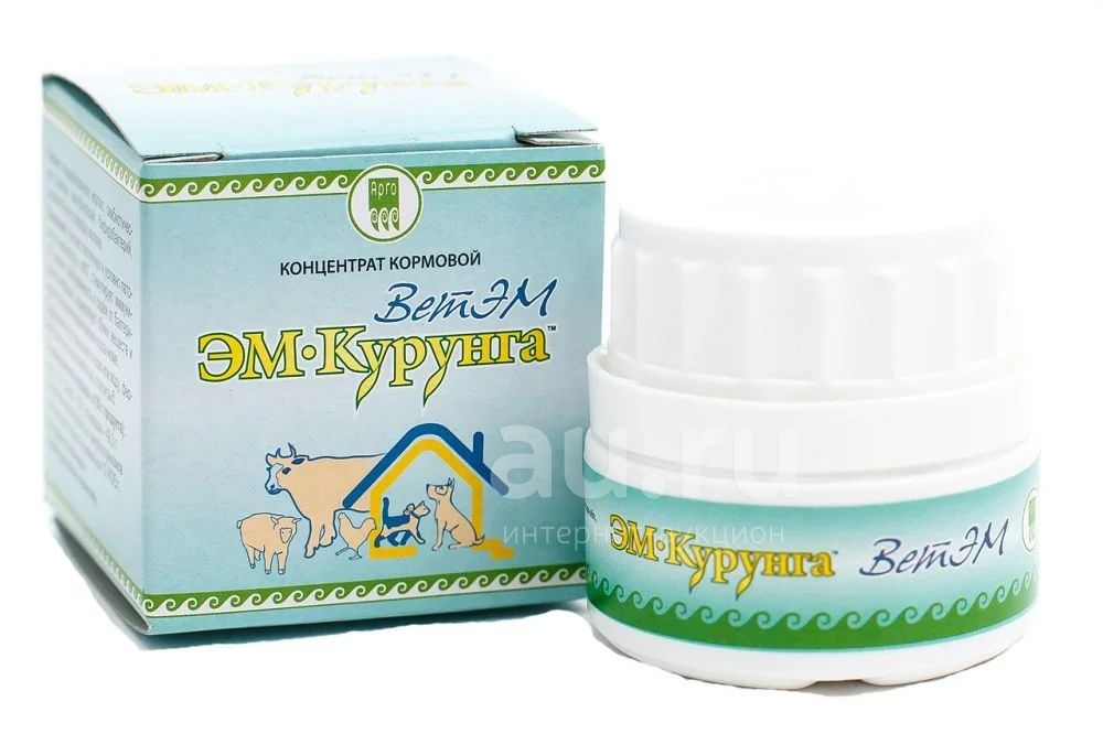 Концентрат кормовой «ЭМ-курунга» (ВетЭМ), созданный на основе оригинального кисломолочного симбиоза, стимулирует иммунитет, угнетает патогенную и условно патогенную микрофлору в ЖКТ, снижает заболеваемость и падёж от бактериальных инфекций, нормализует обмен веществ и кислотно-щелочное равновесие в организме животных, птиц и рыб.