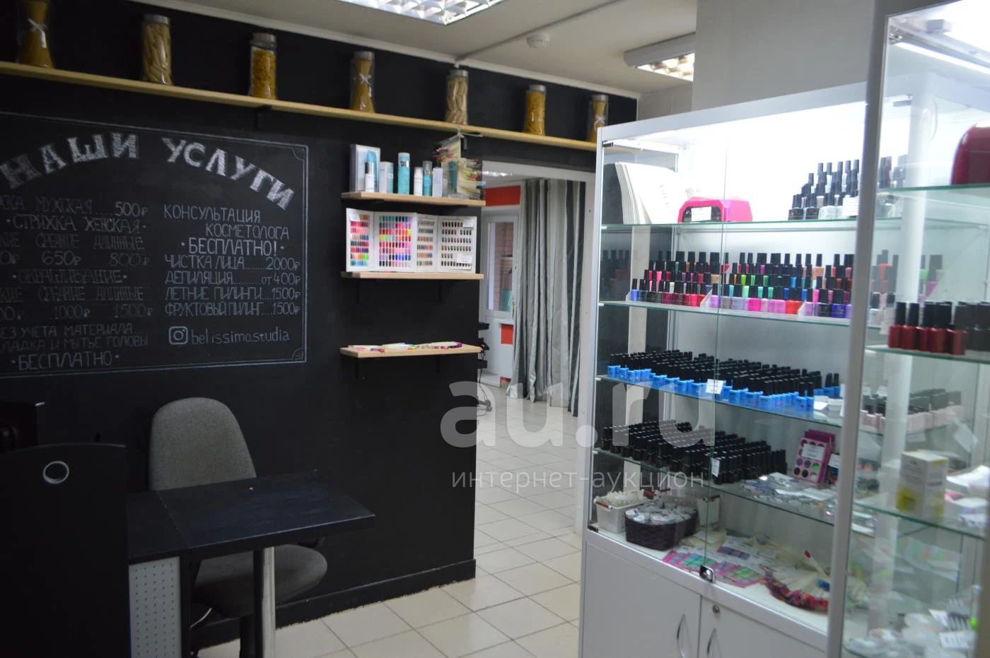 Весь набор профессионального оборудования: стойка администратора, кресла, столы, лампы, сушуар, стеллажи, койка, полки, тележки, кресла, утюжки, стерилизатор, косметологическое кресло, штендеры, зеркала маленькие и большие, стеклянные витрины и т.д.
