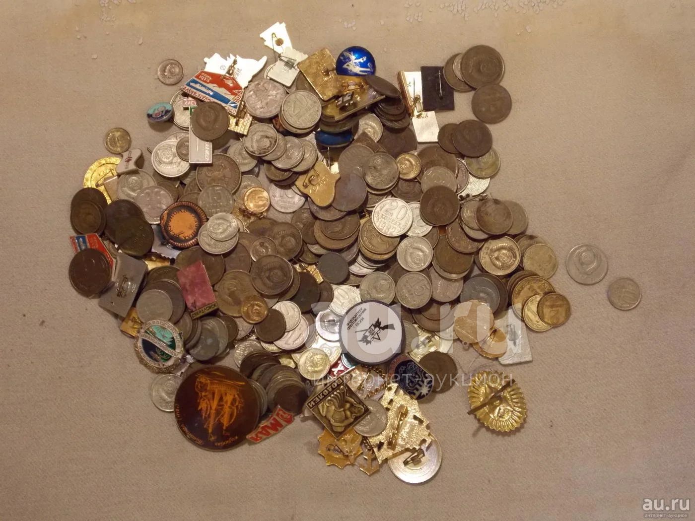 значков 70шт, монет не считал, до 1 кг если по весу судить