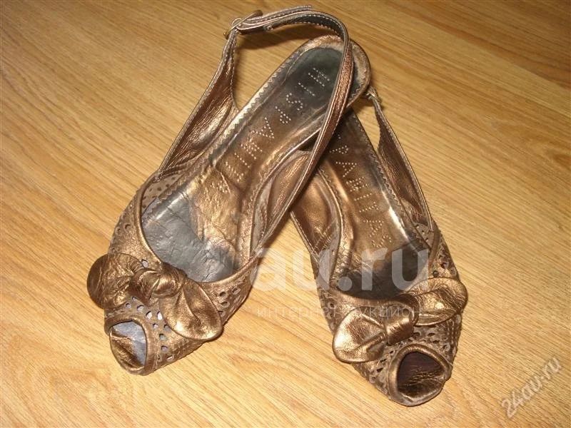 Босоножки бронзового цвета. Состояние удовлетворительное, на фото видно. Требуют замены набоек. Это всё значительно сказывается на цене (покупала за 3500 р.). НО! Кожа натуральная и очень удобные. Возможно на сменку в школу и просто на лето.