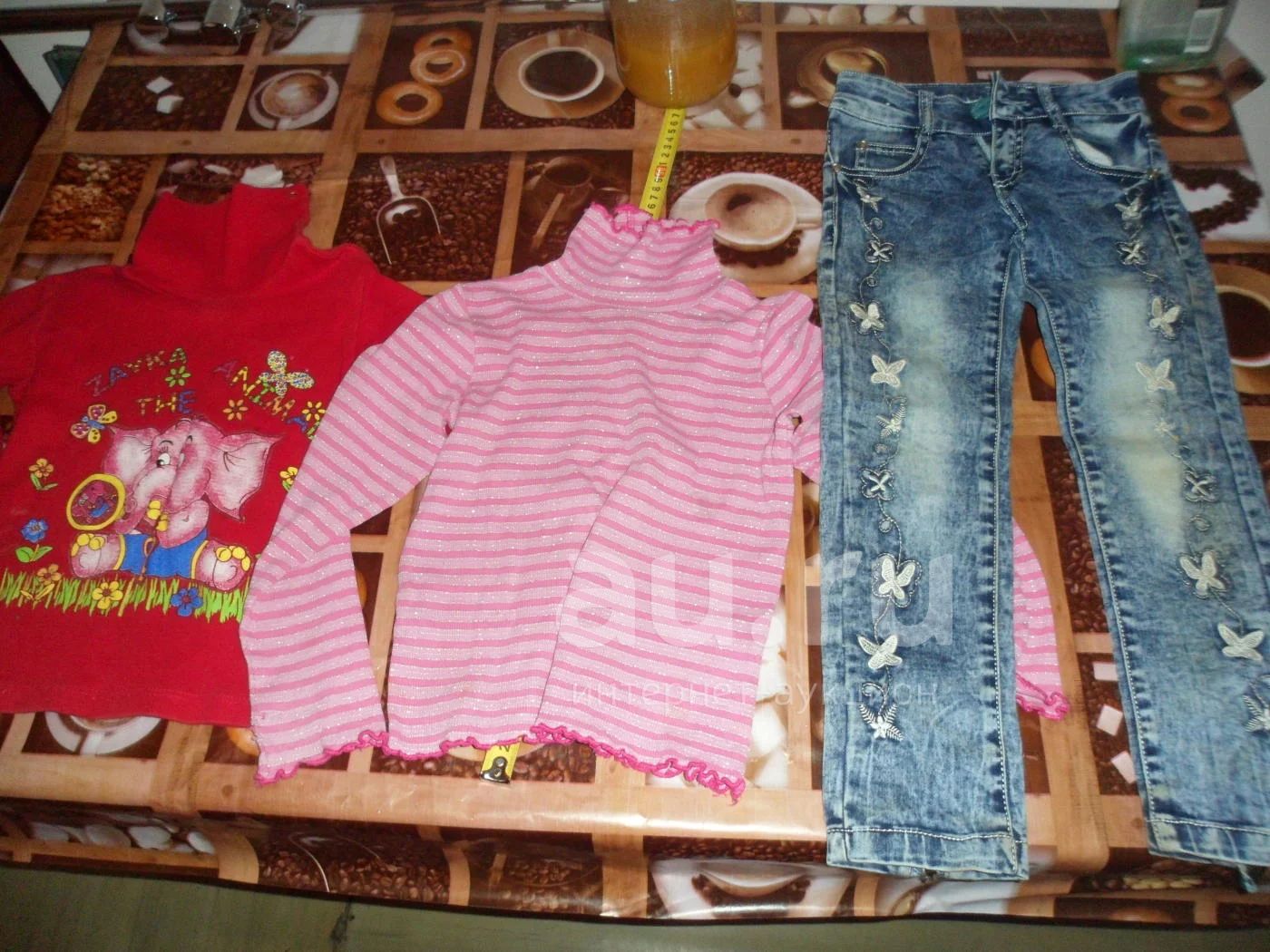 В лот входят: джинсы (внизу замочки, для худеньких девочек), две кофты ( которые на первом фото), водолазка, две белые кофты( одна с сердечком на груди, другая вертикальная блестящая полоса) и черные шорты( мы носили в садике на физкультуру).