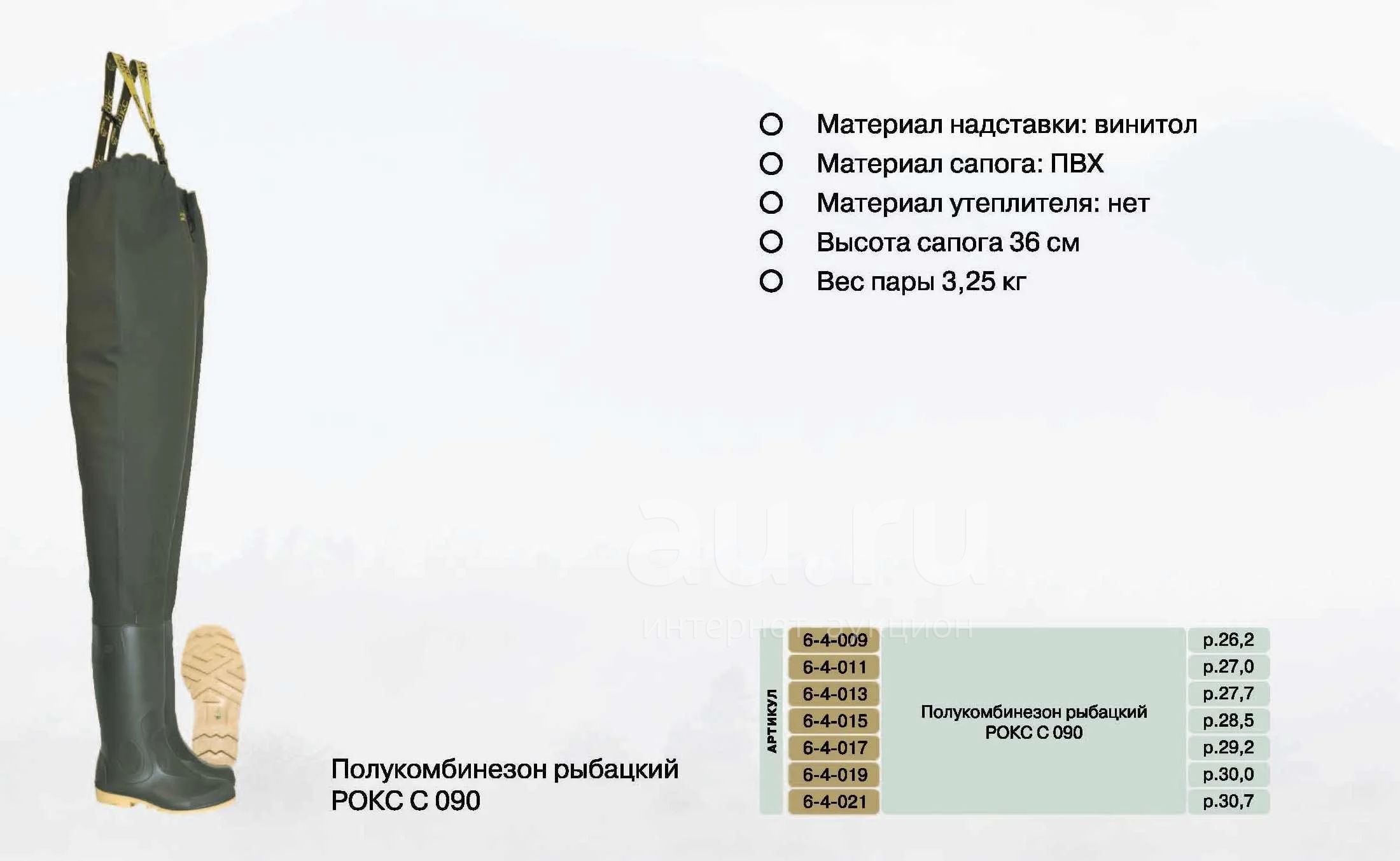 Описание: Полукомбинезон с регулируемыми по высоте лямками и пластиковым разделителем на спине, удобным внутренним карманом. Полукомбинезон изготовлен из водонепроницаемого материала (трикотажного полотна пропитанного ПВХ) и приварен к сапогам.