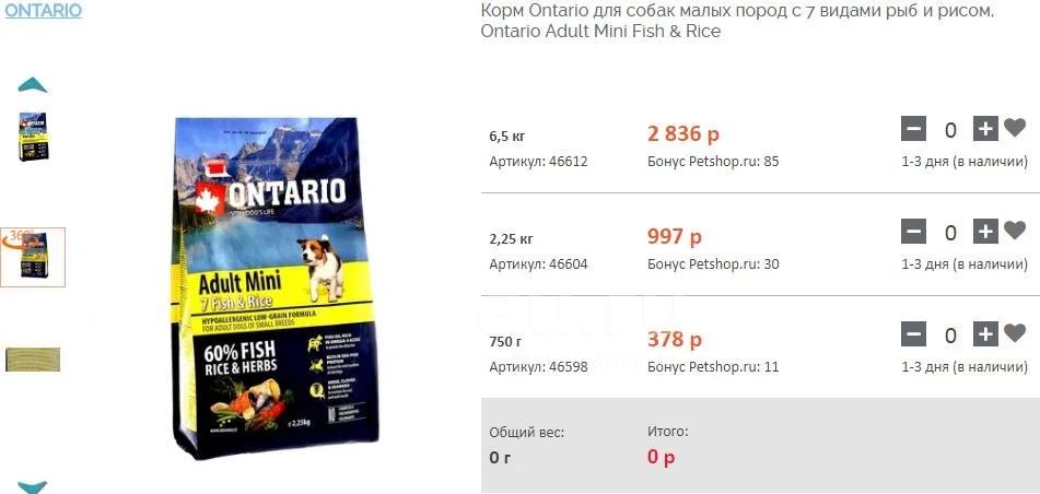 Корм Ontario для собак малых пород с 7 видами рыб и рисом, Ontario Adult Mini Fish & Rice, 6,5 кг
