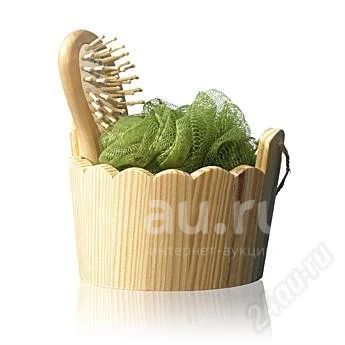 Деревянное ведерко с мочалкой и массажной щеткой для волос.