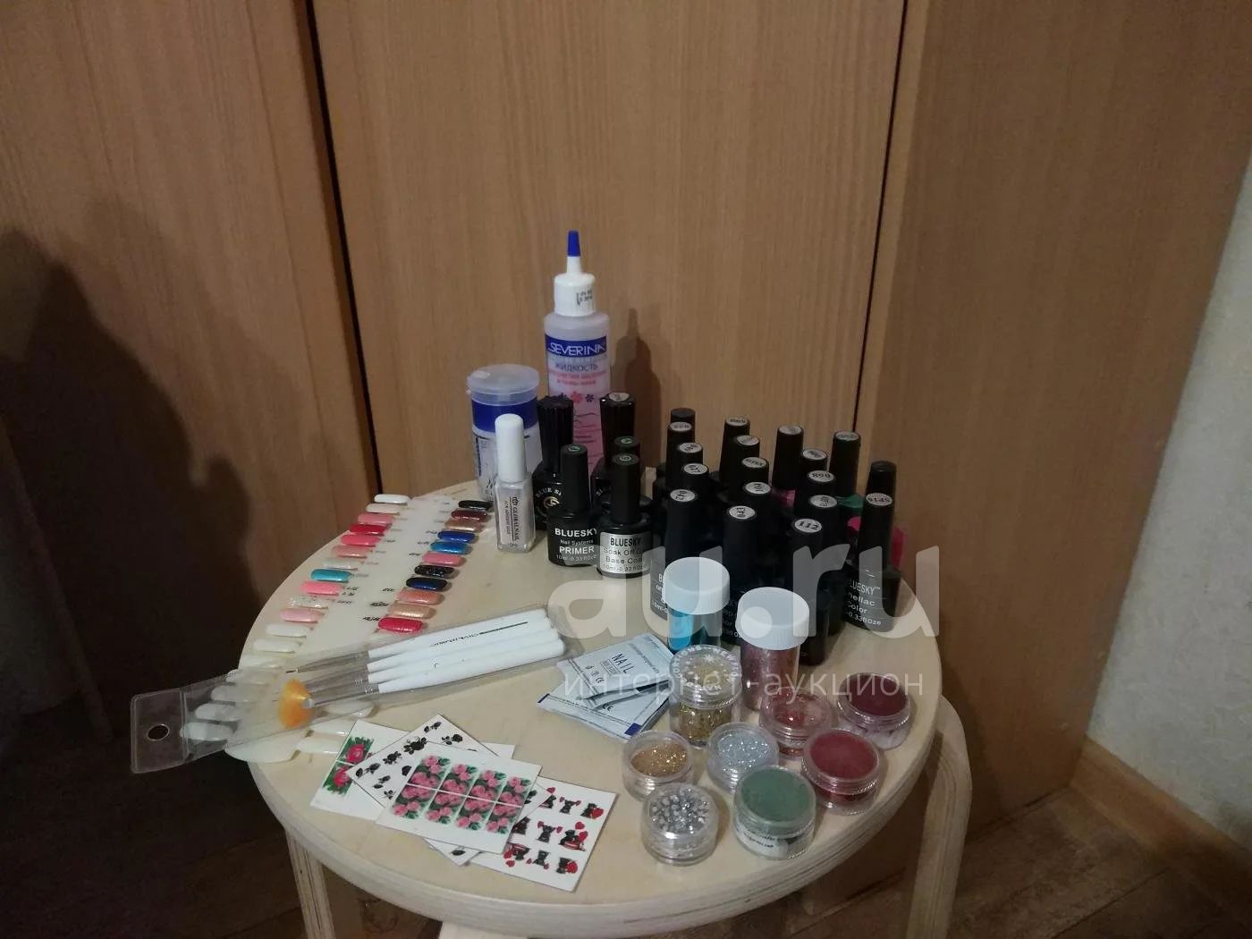 Продам набор для шеллака. Праймер, топ, база. 20 цветов, все почти полные. Кисточки 4шт, наклейки на ногти 4 вида, блёстки 7 видов, 2 вида фольги, стразы. Клей. Жидкость для снятия лака "Северина". Баночка с дозатором. Образец ногтей для выкраски цветов.