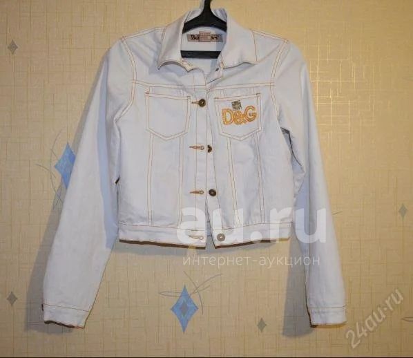 Коротенькая белая джинсовка.Есть небольшие еле заметные пятнышки на правом рукаве,а вообще она в хорошем состоянии,пуговицы (со стразами) все на месте.D&G