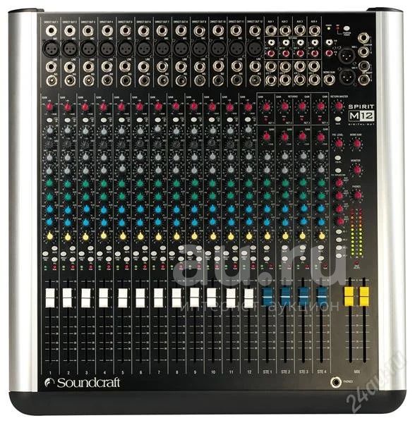 SOUNDCRAFT SPIRIT M12 20-канальный микшерский пульт, 12 мик/лин. входа 4 стерео канала, 3-полосный эквалайзер с параметрическим Mid диапазоном в моно каналах, 4 AUX посыла, 4 стереовозврата, S/PDIF, выход RCA, входы/выходы на магнитофон, direct выходы, фейдеры 100 мм.