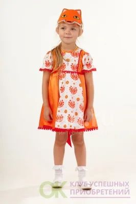 Карнавальный костюм Лиса-Любонька - яркий образ на детский утренник или для постановки спектакля. Нарядное платье с рукавами-фонариками отороченное по низу красивым кружевом, сзади завязывается на пояс. Для завершения образа используется маска лисы. Застежка-молния.