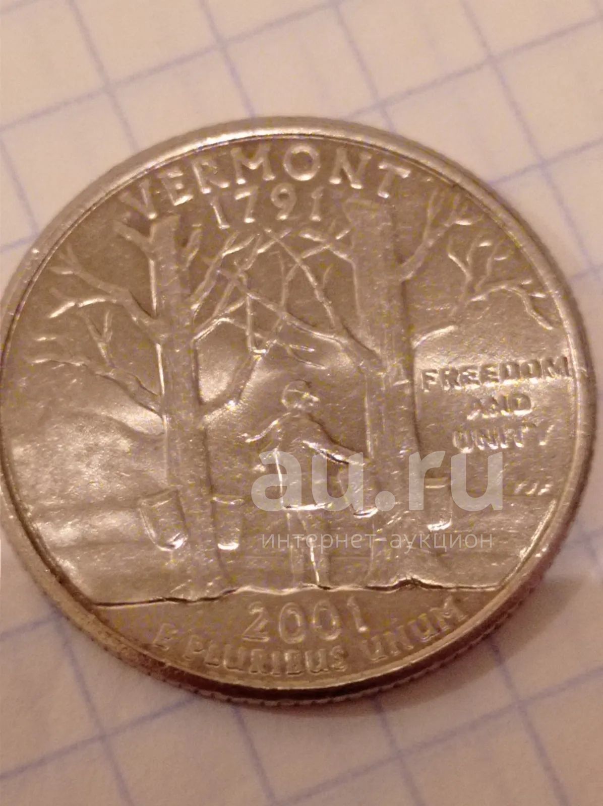 Квотер (25 центов) 2001 год. Штат Вермонт. Сбор сока кленовых деревьев на фоне горы Горб Верблюда.