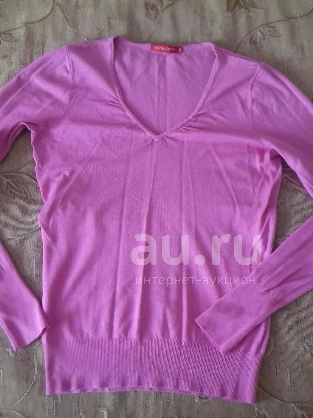 Цвет розовый, размер скорее40-42, дефектов и катышков нет. Нужно погладить. В реале цвет более светлый, нежно розовый.
