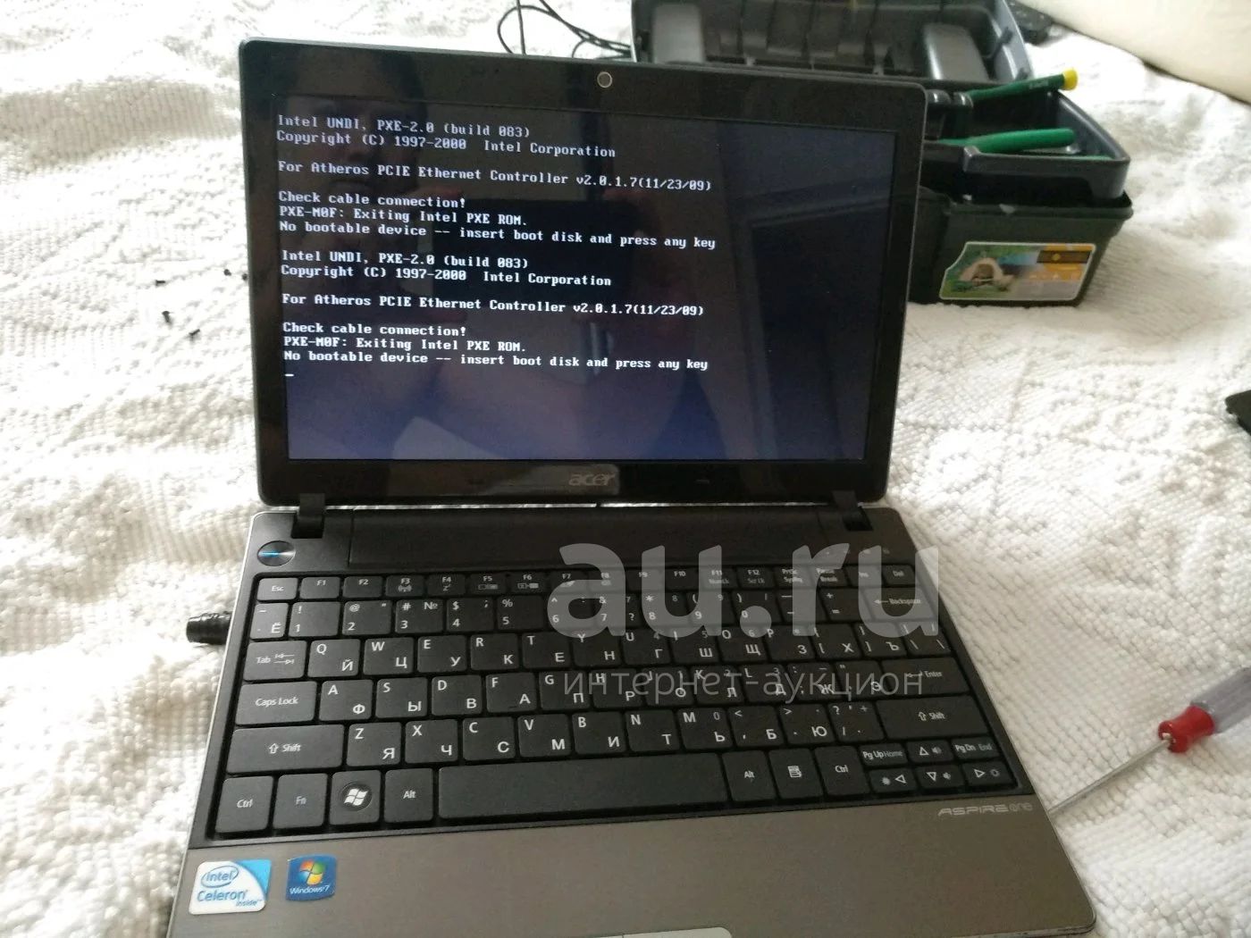 На запчасти. Винчестера нет. Включается см. Фото. Пользователь говорит что не работает часть клавиатуры. Установлена планка на 2гб.
