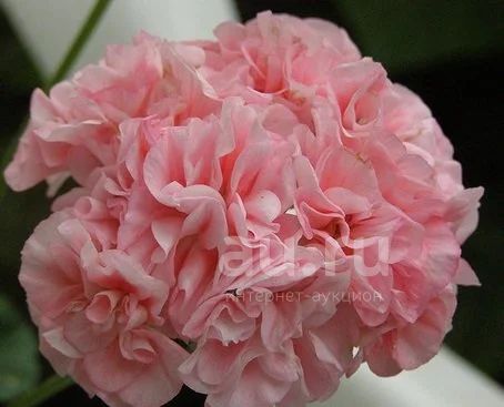 Черенок зональной пеларгонии. Куст небольшой. Цветок махровый, крупный с лепестками бледно-розового цвета с ярко розовой серединой. Соцветие крупное мощное. Лист зеленого цвета, крупный с концентрической зоной коричневого цвета в середине.