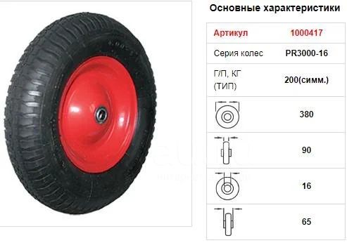 PR3000-16 - Пневм. колесо, мет. обод, симм. ступица, шарикоп. (380 мм, ось 16 мм, 4.00-8)