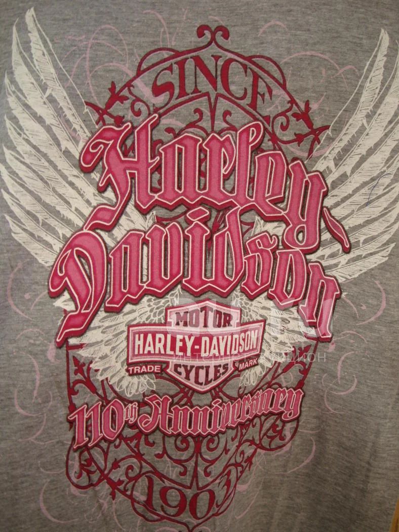 Байкерская женская футболка Harley Davidson из светло-серого меланжевого трикотажа (80% хлопка и 20% полиэстера). Очень красивый большой принт, где оттенки розового беспроигрышно сочетаются с серым цветом футболки. Футболка была выпущена к 110-й годовщине компании ограниченной коллекцией. Сзади небольшой принт с названием и логотипом бренда, названием клуба, названием города El Paso, названием штата Texas. Футболка размера М подойдё на 44-46 российский размер.