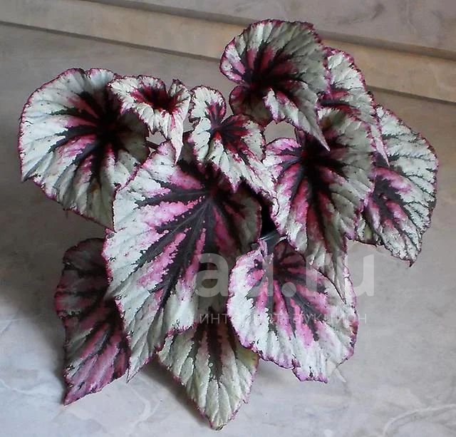 Необыкновенной красоты бегония: серебристая листва, темно-розовая серединка с черными прожилками.