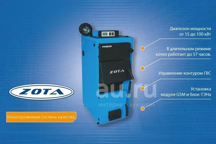 Котел-полуавтомат ZOTA «Magna» с диапазоном мощности от 15 до 100 кВт разработан для сжигания в качестве топлива угля любой фракции, дров и топливных брикетов. В качестве резервного (дополнительного) источника энергии можно использовать электричество. Блок ТЭН и модуль управления поставляется опционально.