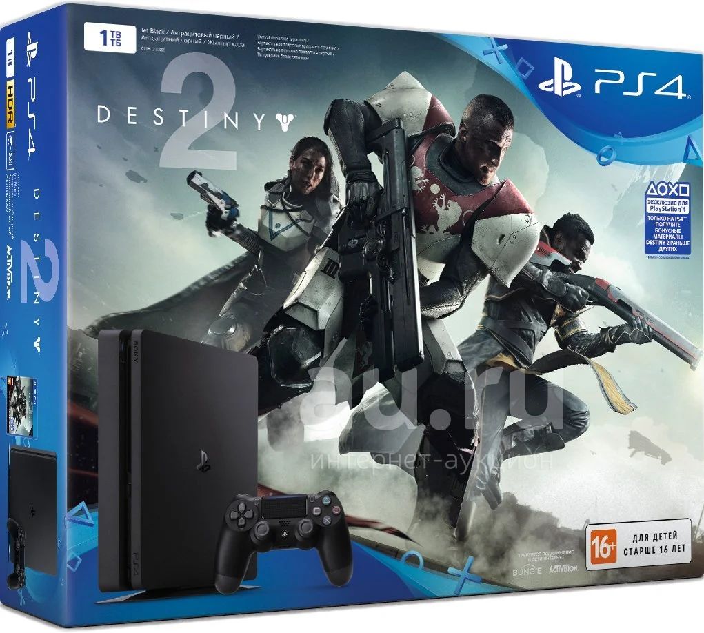 Sony PlayStation 4 – приставка, открывающая доступ в мир увлекательных современных игр. Благодаря компактному тонкому корпусу она не только элегантно выглядит, но и хорошо вписывается в интерьер. Вместе с ней вы получите популярный многопользовательский шутер Destiny 2, действие которого происходит в мире будущего.