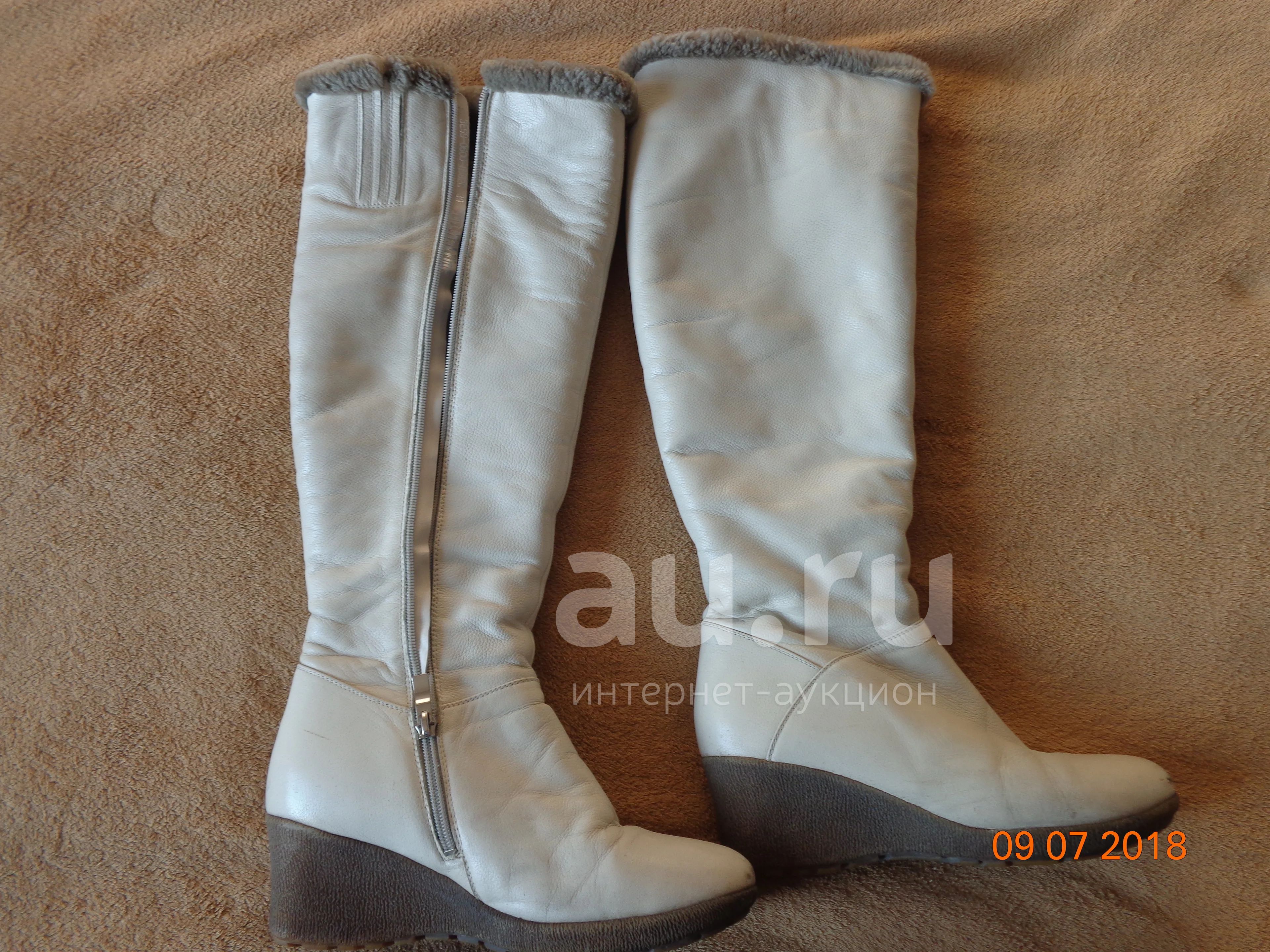 Очень теплые зимние сапоги MakFine, натуральная кожа, натуральный мех (голенища в очень хорошем состоянии, стелька протерлась) молочного цвета, размер 39, состояние удовлетворительное (местами кожа протерта и поцарапана), высота голенища от пятки, примерно, 36 см., ширина, примерно, 19 см. в самом широком месте. Подошва не скользит, каблук 5 см.