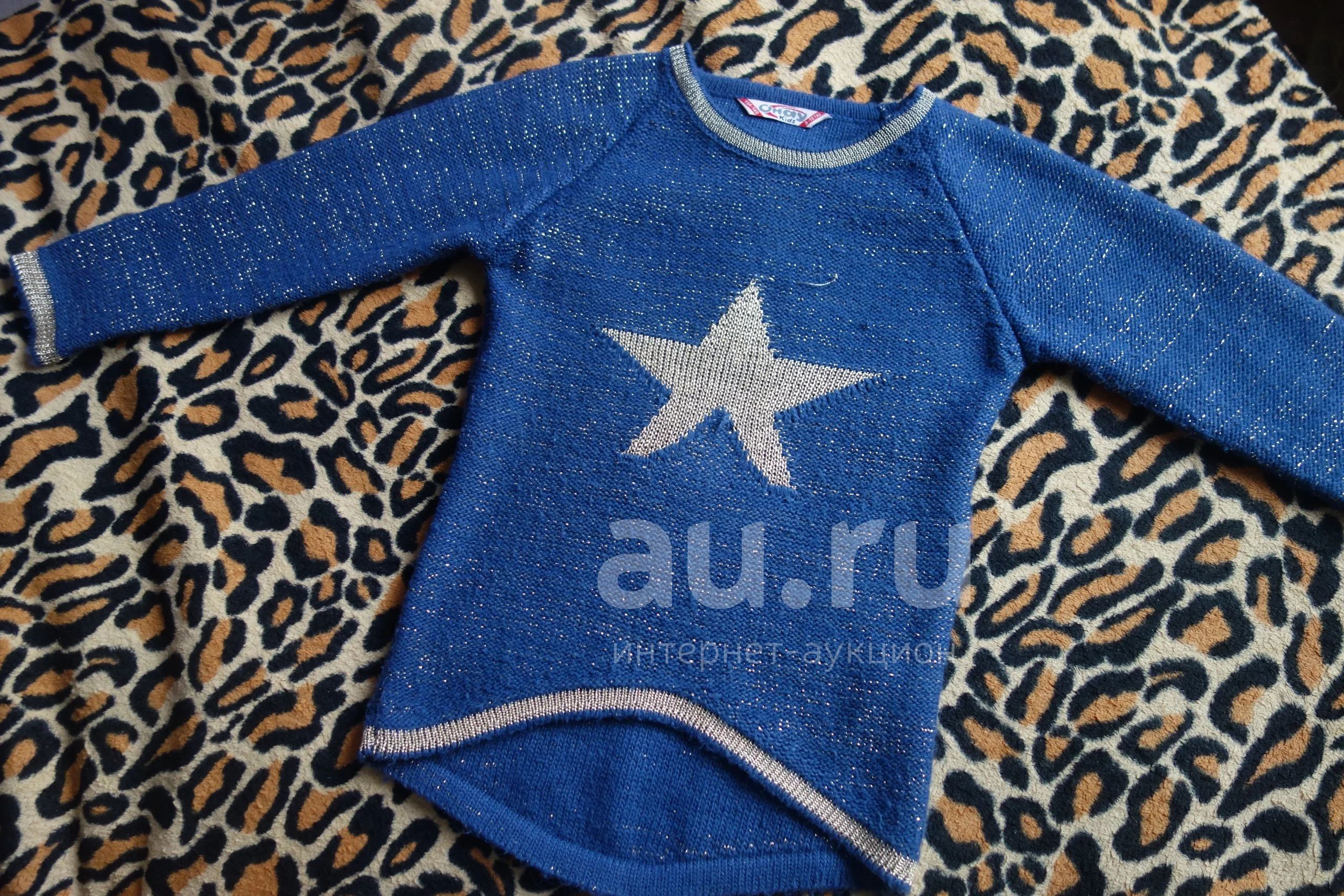 Теплая вязаная кофта синего цвета с золотой звездой на девочку 5-7лет. Б/у, состояние отличное.
