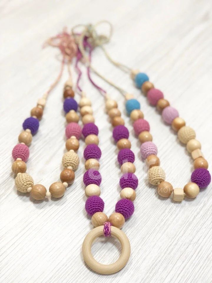 Бусы можно носить на лямке эрго-рюкзака или на шее по время слингоношения. Или вы сможете снять бусы с шеи и дать поиграть ребенку, чтобы отвлечь его.