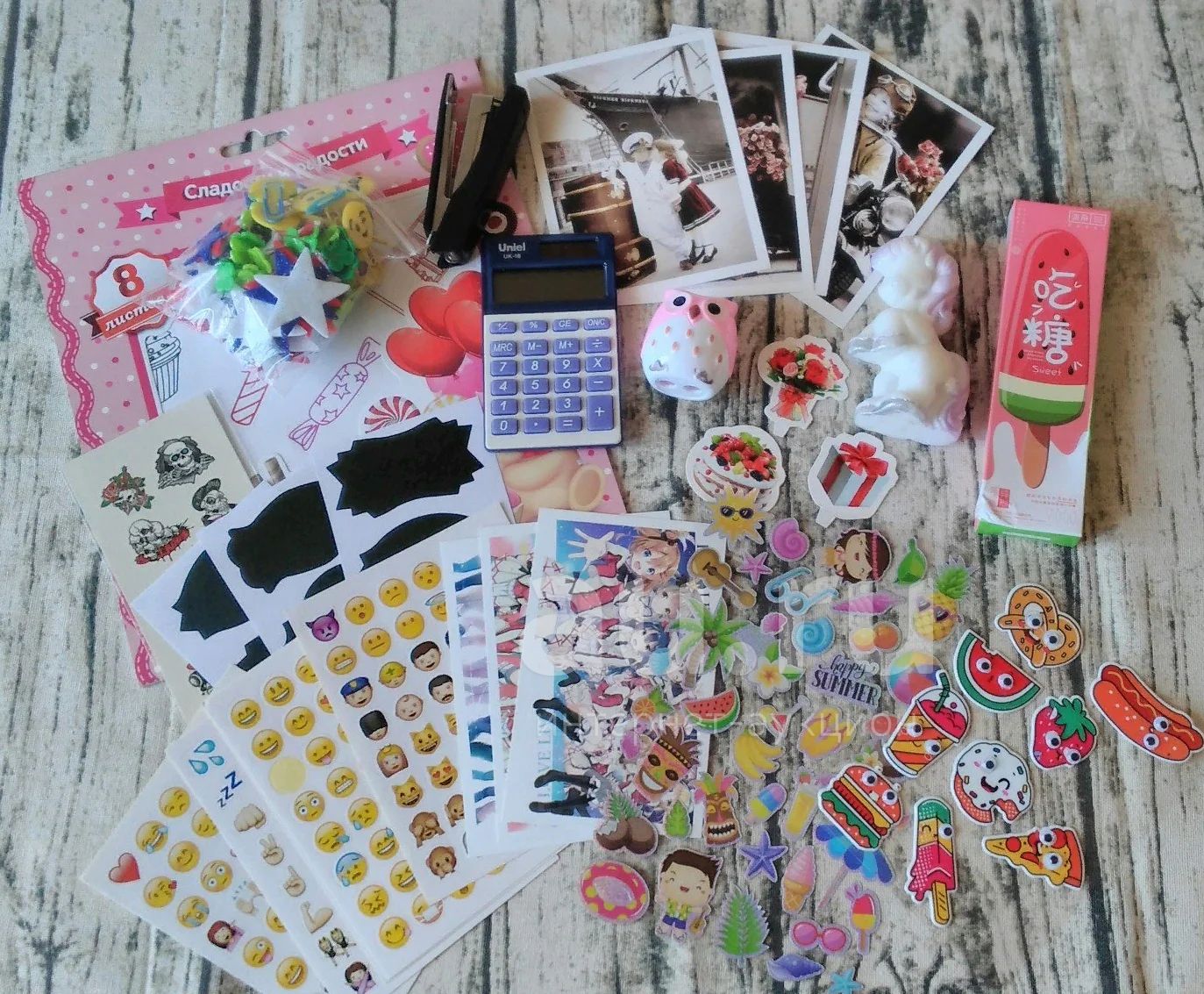Набор канцелярии (наклейки, открытки, калькулятор, степлер, закладки, скрепки и т.д)