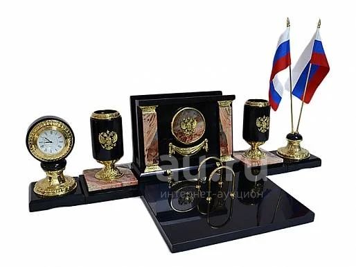 Письменный прибор изготовлен из природной яшмы в сочетании с долеритом, элементы декора выполнены из бронзы, часы с кварцевым механизмом. Размер изделия; общая длина 600 мм, ширина с календарницей 290 мм, высота с флагом 320 мм.