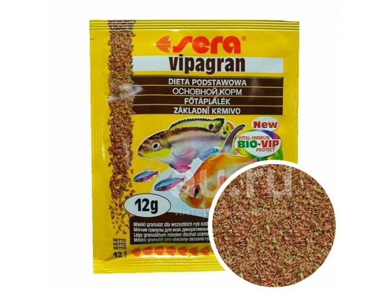 Sera (Сера) Випагран 12гр - гранулы - Новый плавающий гранулированный корм SERA випагран исключительно легок и полезен. Благодаря мягкой консистенции и компактному размеру гранул его можно заглотить целиком или откусывать по кусочку, что не отпугнет даже самую привередливую рыбку.