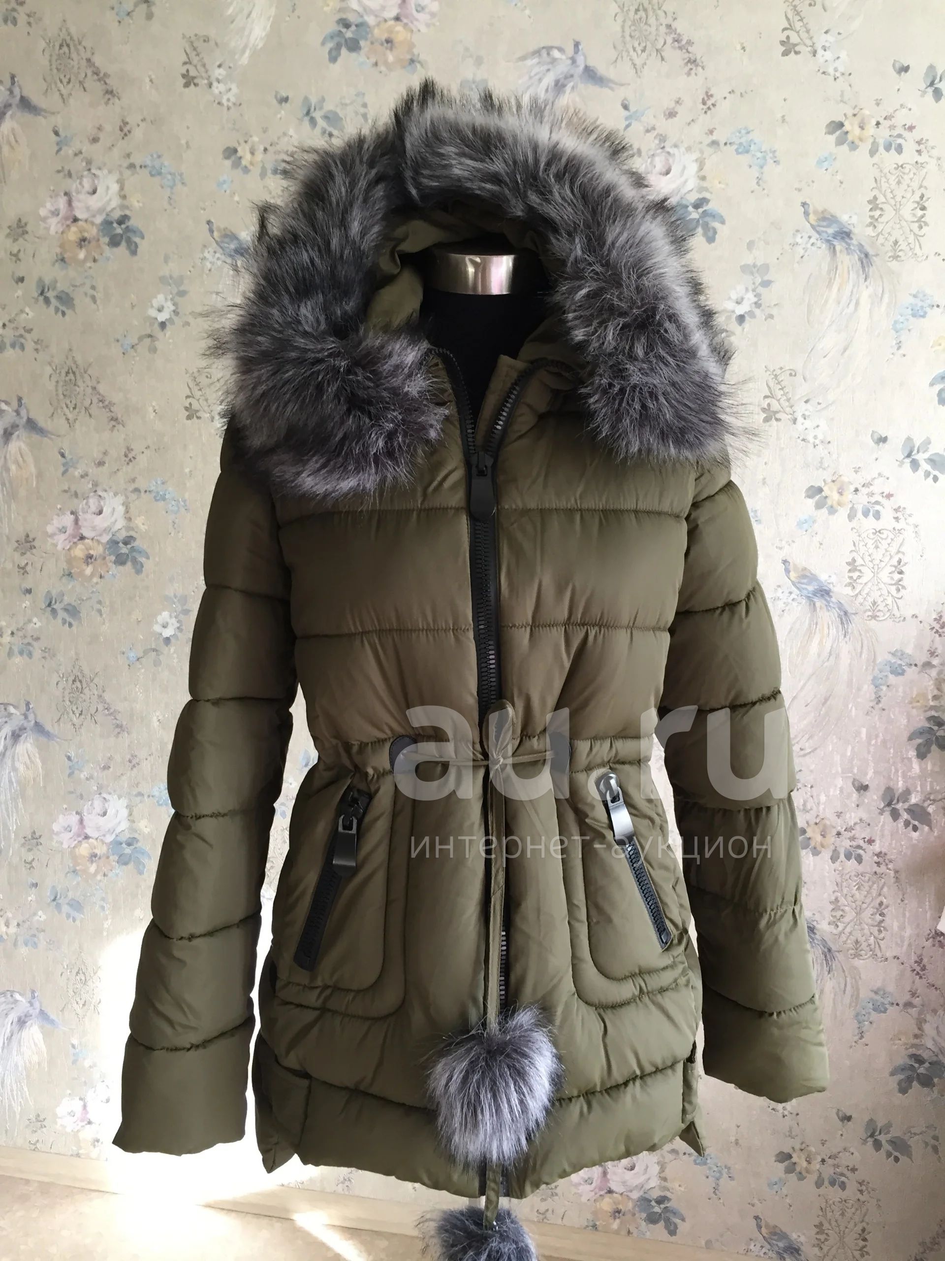 Новая куртка/пуховик. Интересный цвет (хаки). С капюшоном, мехом, карманами.