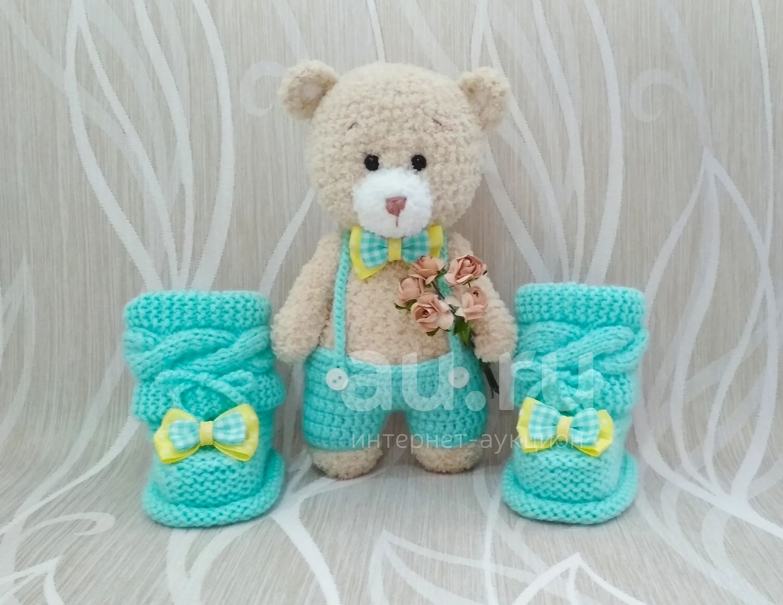 Продам набор, игрушка-погремушка и пинетки. Отличный подарок на рождение малыша. Высота игрушки около 17 см. Работа выполнена из пряжи для детей.