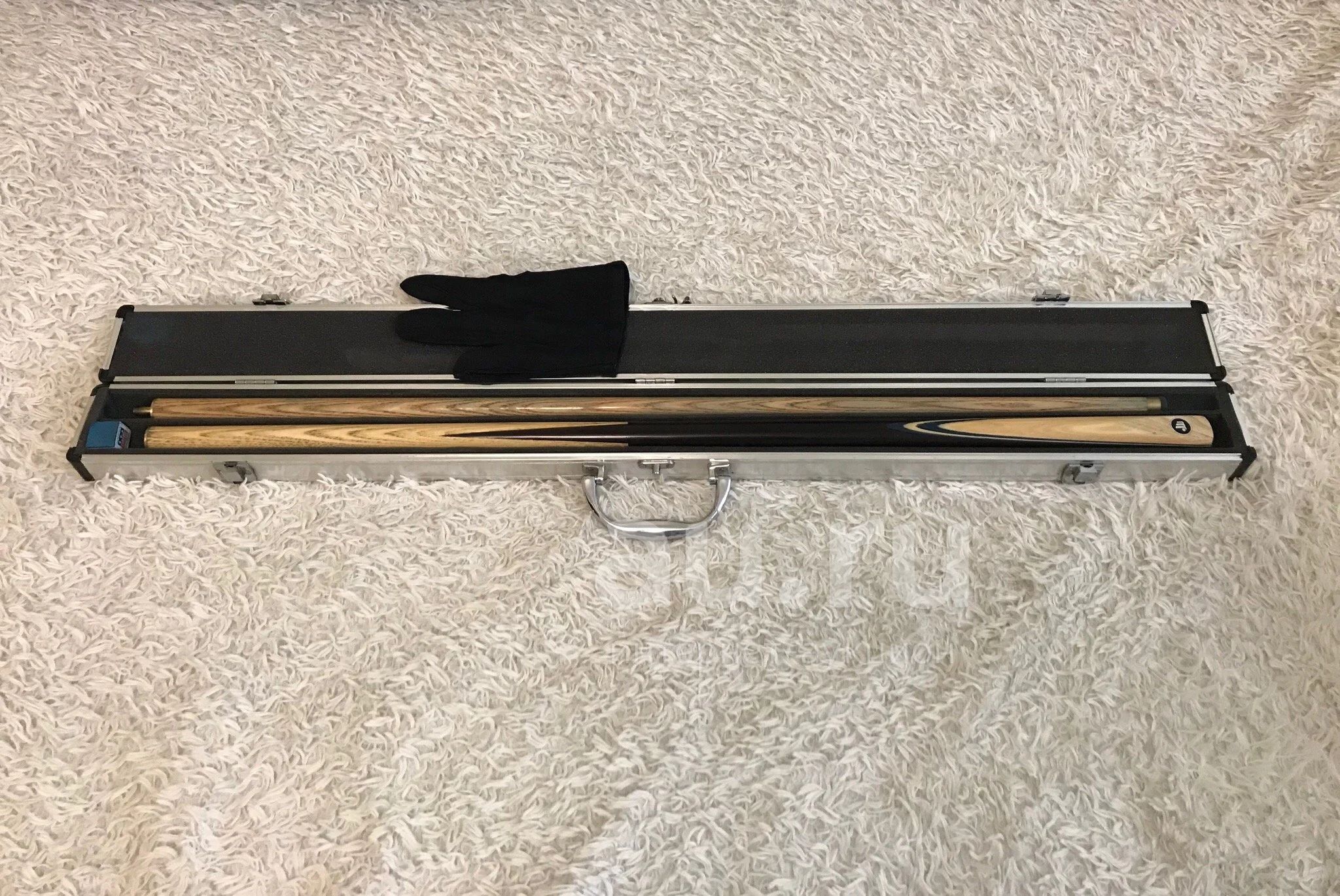 Деревянный кий в футляре. В комплекте перчатки и мел. Без повреждений.