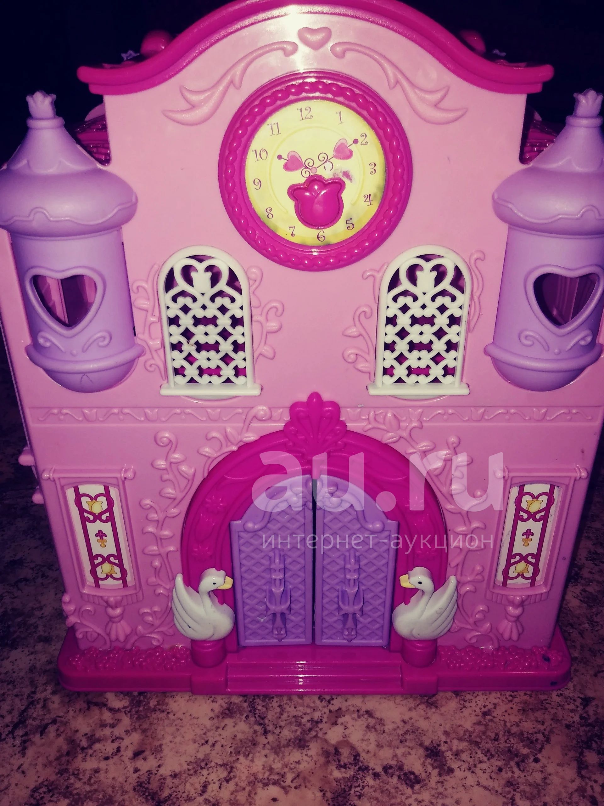 Дворец для куклы. Складывается пополам, есть ручка, как у чемодана. В высоту около 40-45 см. Часы музыкальные, играют несколько мелодий. Дефектов нет, все целое. Смотрите другие мои лоты. Много с рубля.