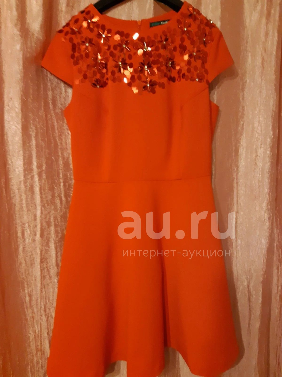 Платье выше колена, приталенное, пышная юбка. Красивое, комфортное.Есть маленькое пятнышко и затяжечка еле видна (все на фото).