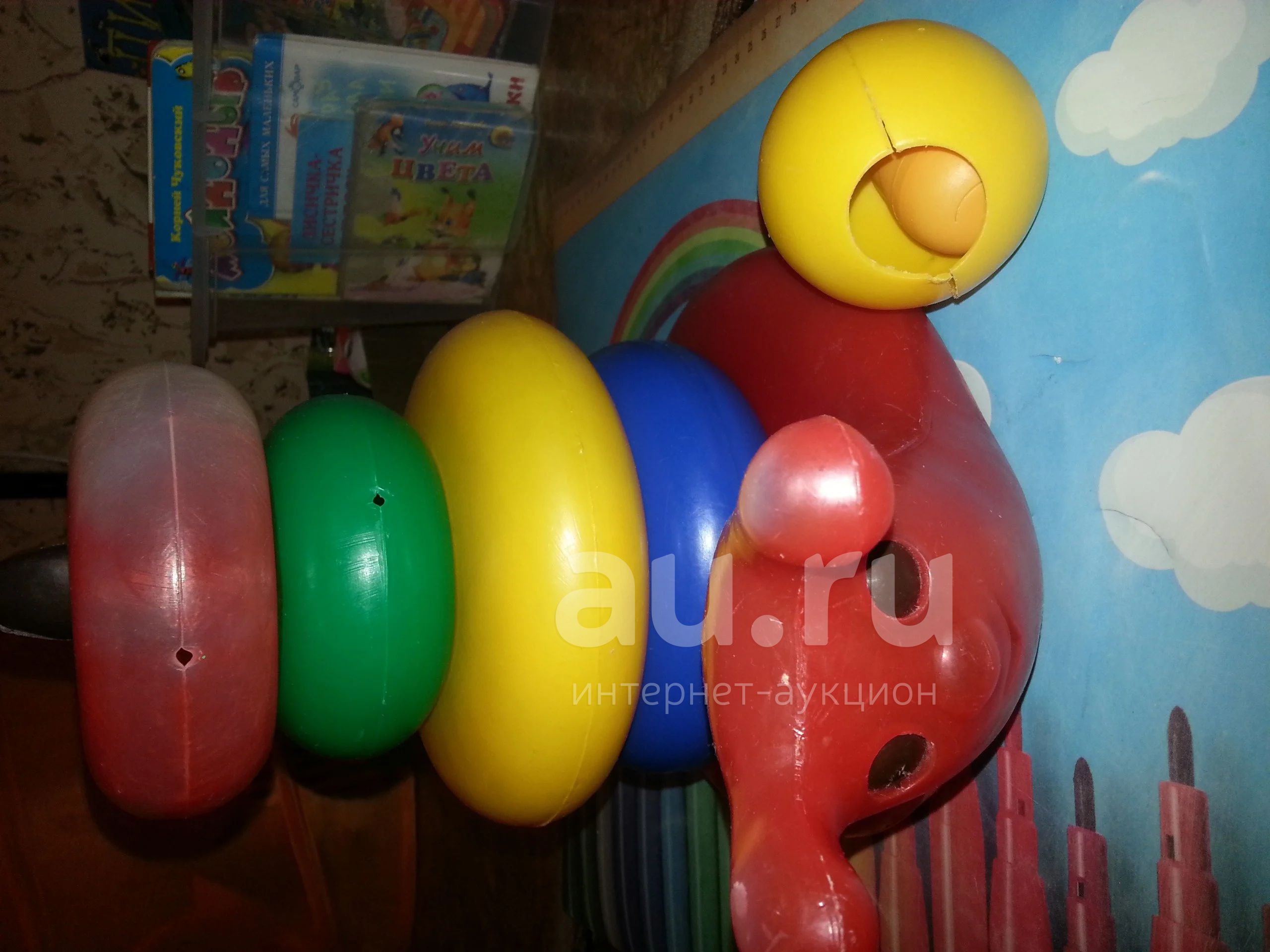 Примерно 30 см в высоту. Есть трещины по швам, на фото видно. Дети ходили на кольцах)) Улитка.