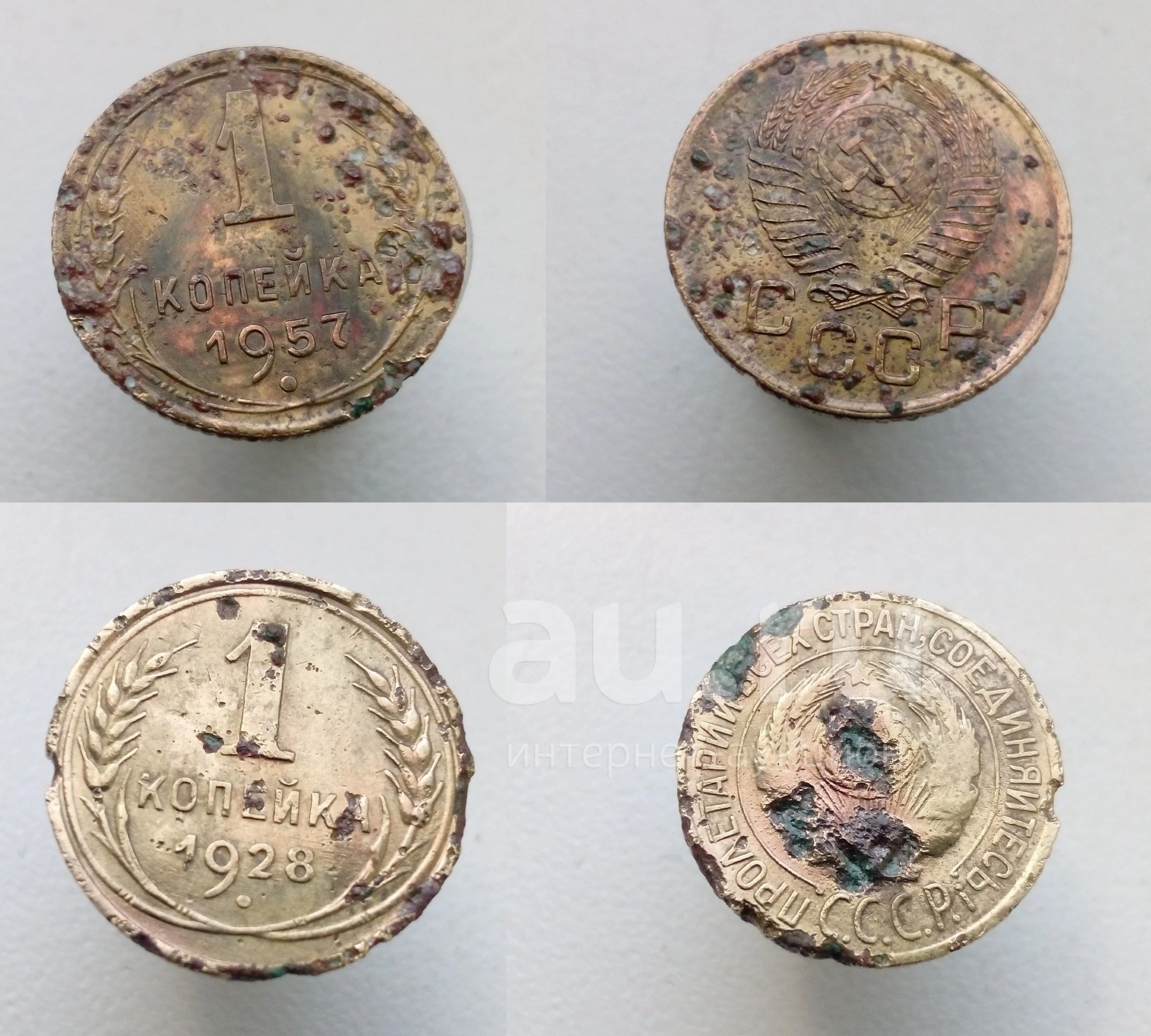 Две убитых монеты СССР 1 одна копейка 1928 и 1957 г 2 шт с рубля