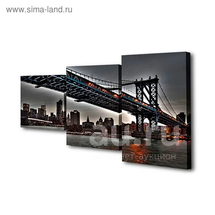 Откройте для себя новое модное решение в дизайне интерьера! Модульная картина на холсте с подрамником "Вечерний мост на Манхеттен" – современный и стильный способ украсить любое помещение, будь то квартира, загородный дом или офис. Картина состоит из трех частей: 30х35, 30х55 и 30х45 см, на каждой располагается только фрагмент изображения. Размещенные рядом части образуют единую композицию, которая привнесет в интерьер яркие акценты. Модуль зрительно расширит пространство любой, особенно небольшой комнаты. Используйте их вместе или повесьте по отдельности: каждый модуль может играть роль самостоятельной картины. Изображение напечатано на искусственном холсте, который натянут на деревянный подрамник. Общий размер 55х94 см.