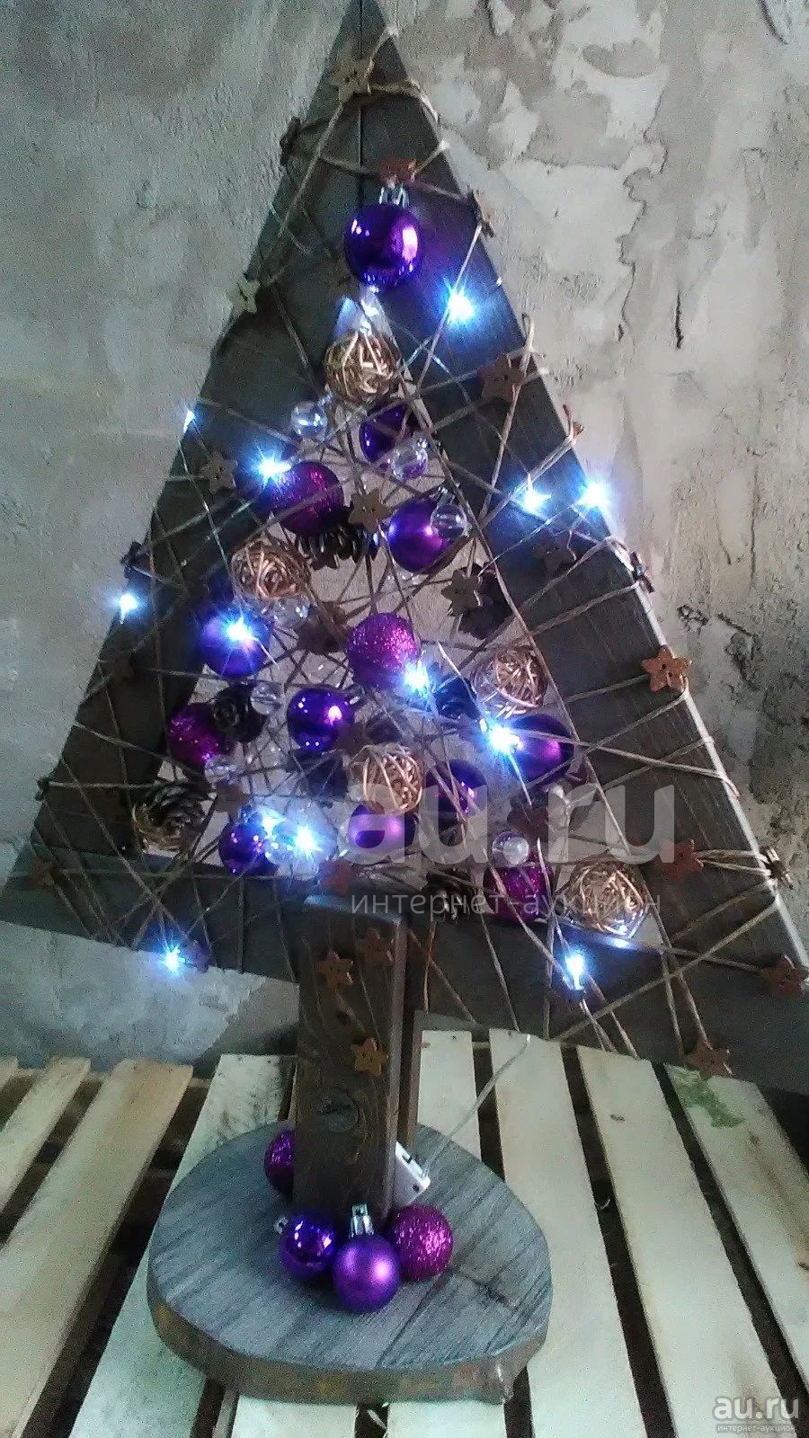Выполнена из дерева и шпагата, дополнена декоративными элементами: шарики плетеные из лозы и пластиковые, стеклярус, деревянные звездочки, шишки и др. Гирлянда светодиодная работает от двух батареек CR2032. (в комплекте). Единственный экземпляр! Высота 54 см, ширина 40 см.