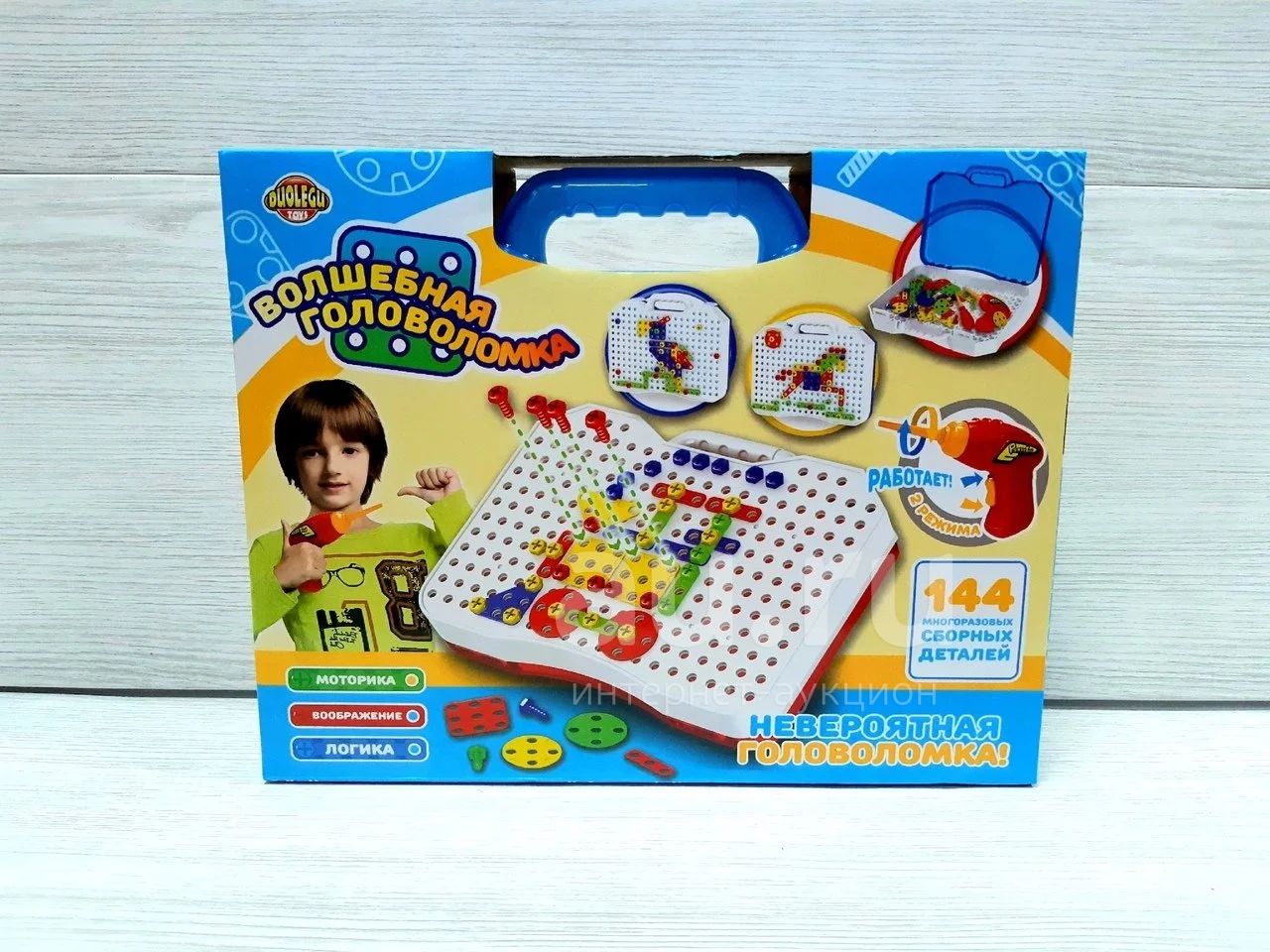 Конструктор "Создай-играй" и электрический детский шуруповерт, 144 детали Детский конструктор из плотного пластика позволит создать различные геометрические рисунки и картинки. Для этого нужно взять специальную подставку, выбрать по инструкции детали, взять шурупы и шуруповерт. И вуаля, картинка готова! С электрическим шуруповертом все просто. В наборе 144 детали. Размер упаковки: 40 см на 26 см