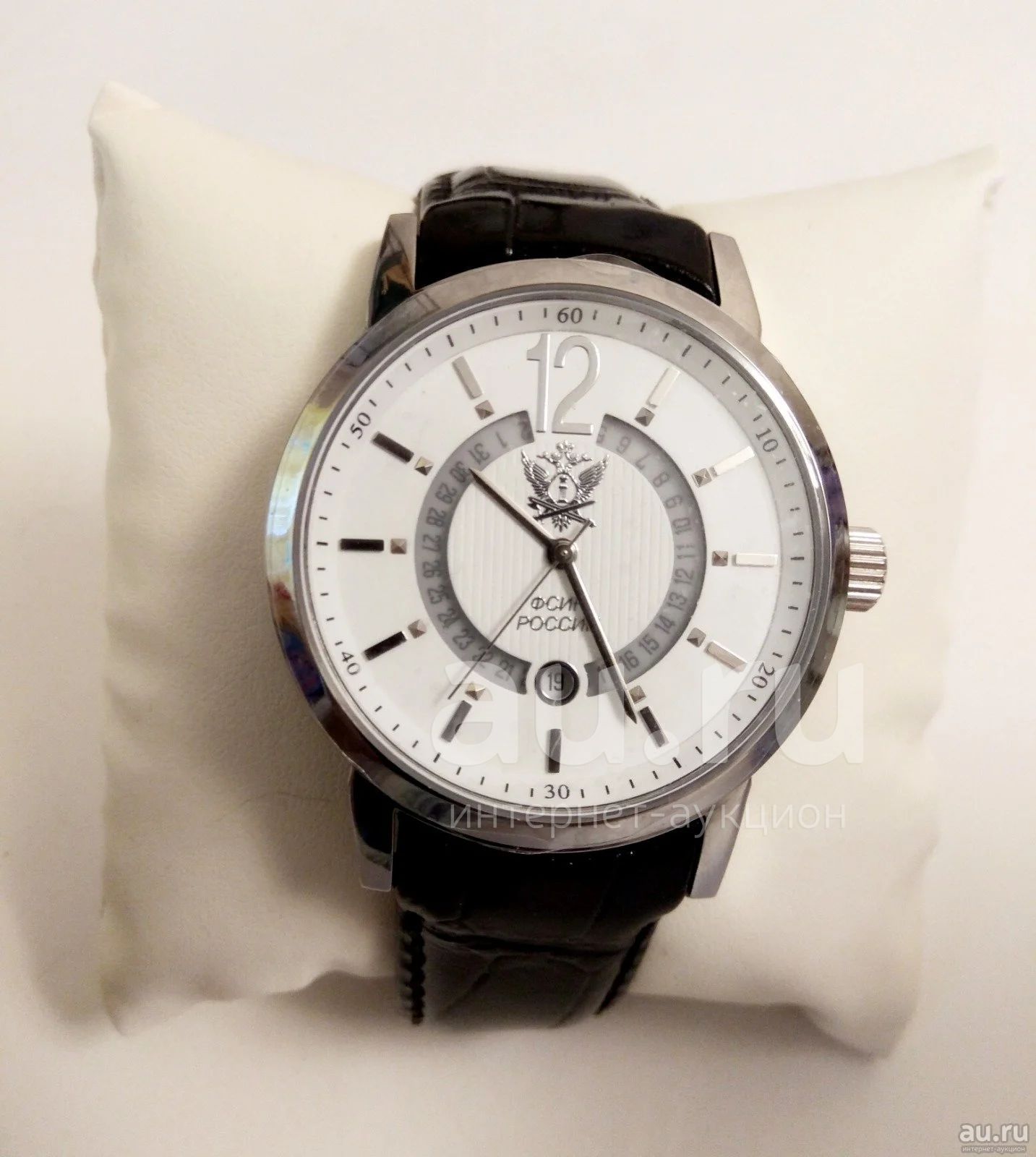 Часы марки «Русское время» с эксклюзивным дизайном: надписью «ФСИН России» (а также эмблемой службы) на лицевой стороне и надписью «От директора ФСИН России» на крышке. Новые, в подарочной коробке с подушечкой, инструкцией.