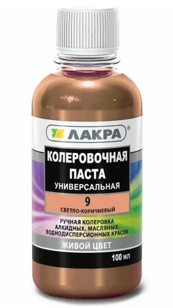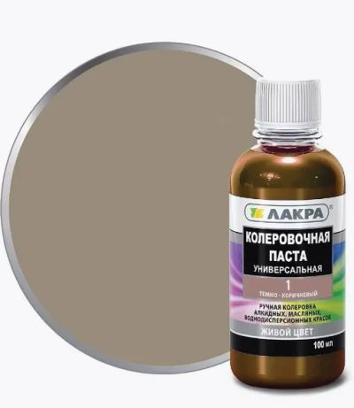 Колер Лакра № 18 Черный 100мл.Для внутренних и наружных работ. Предназначен для тонирования всех видов красок, шпатлевок и декоративных штукатурок на водной основе. Допускает использование в концентрированном виде для специальных случаев оформления интерьеров и фасадов зданий.Область применения: Применяется для ручной колеровки алкидных, масляных, воднодисперсионных красок и составов.Инструкция по применению: Перед применением хорошо встряхнуть. Ввести небольшое количество колера в часть краски, тщательно перемешать. Полученную смесь разбавить белой краской до желаемого оттенка. Максимальное содержание колера в краске не должно превышать 10%.