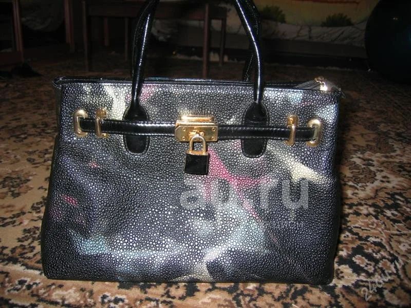 ручки и днище под лакированную кожу, украшена лакированным ремешком и замочком.