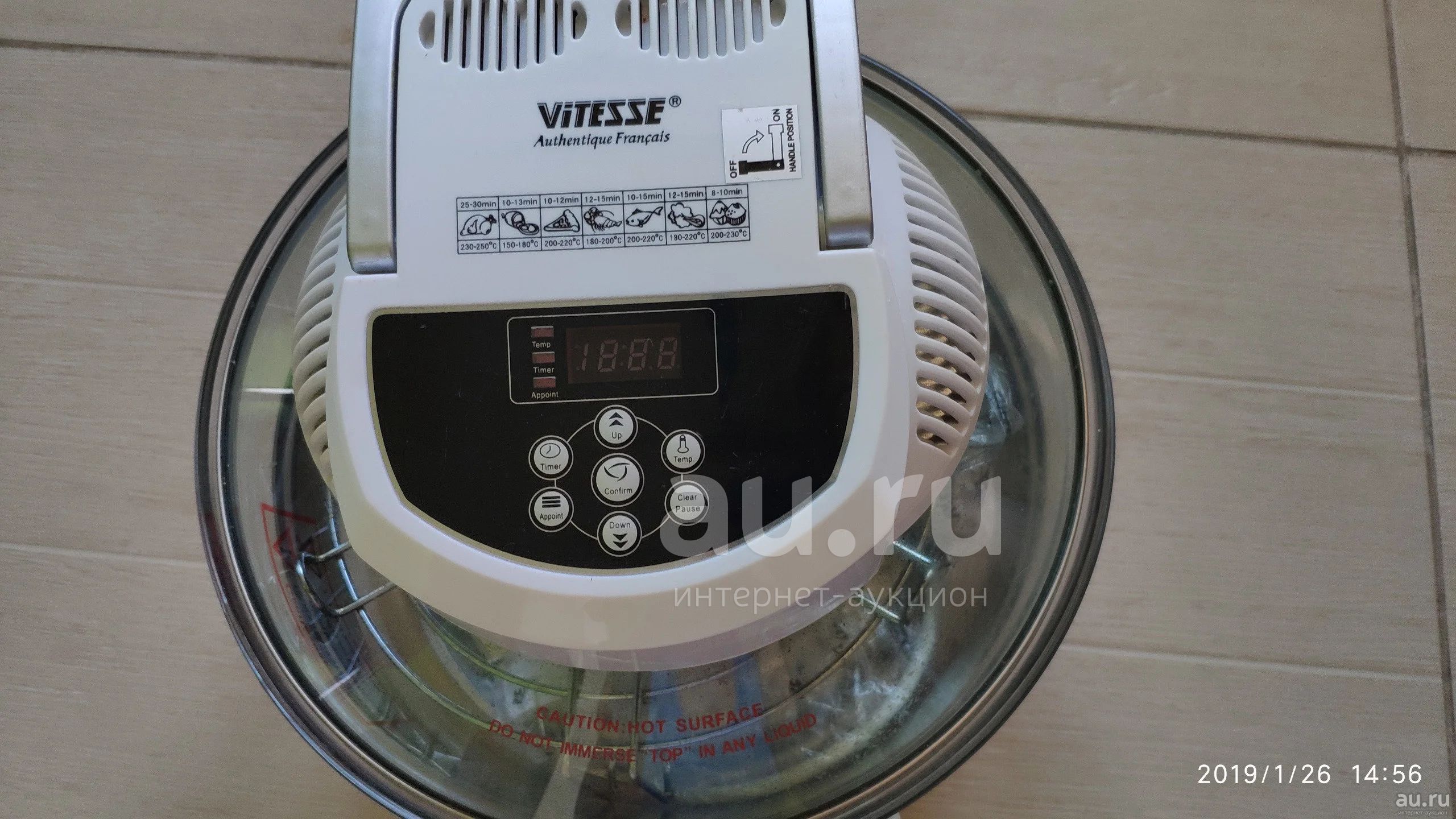Максимальная мощность модели – 1300 Вт. Аэрогриль Vitesse VS-408 снабжен таймером на 180 минут и возможностью регулировки температуры нагрева до 250º. Чаша диаметром 330 мм изготовлена из жаропрочного стекла