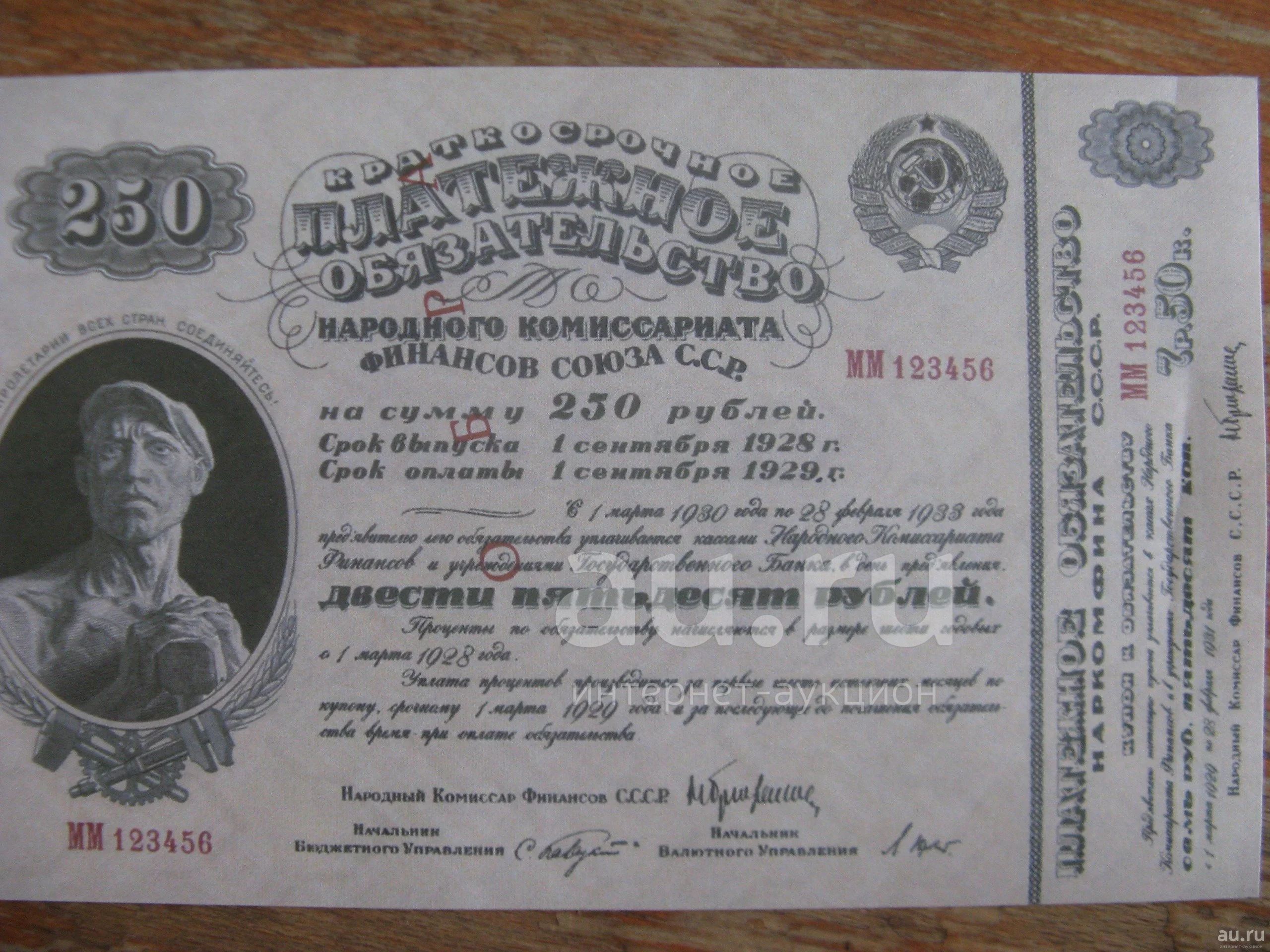 250 рублей 1928-1929 года. Краткосрочное платежное обязательство народного комиссариата финансов СССР. Водяные знаки.