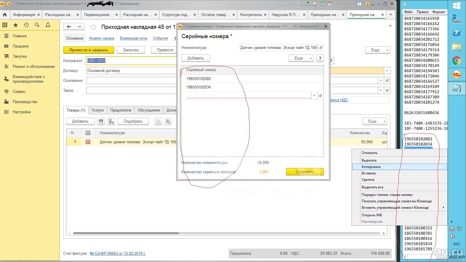 Например так , заходим в документ прихода, нажимаем загрузить файл текстовый , выбираем и все серийные номера на месте.