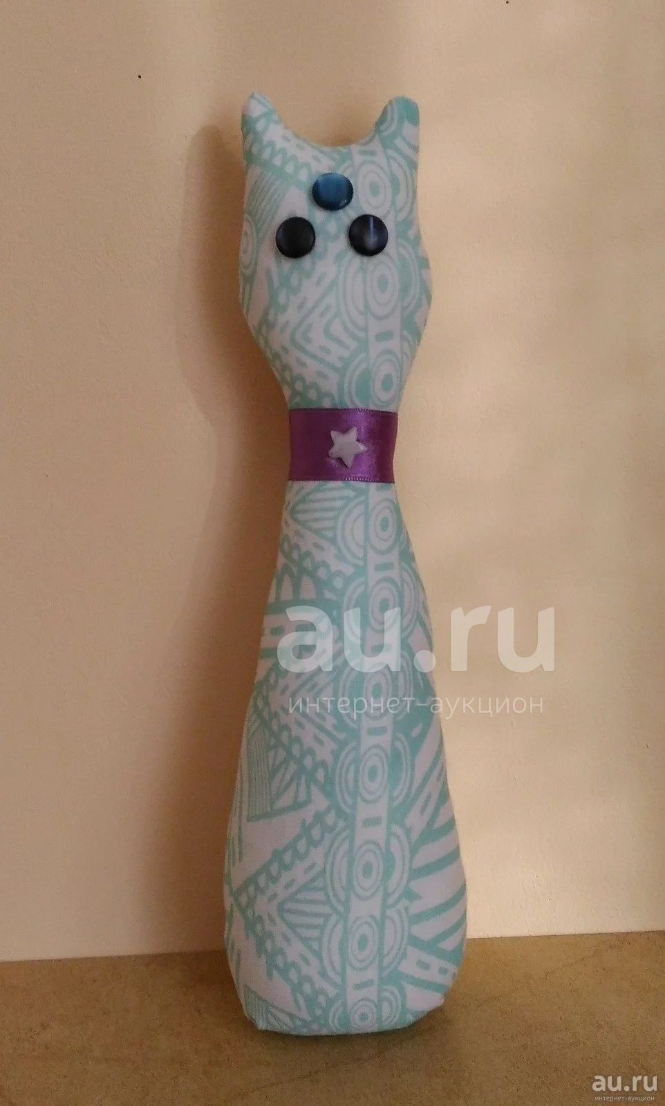 Кот сделан из ткани (хлопок+полиэстер) и наполнен синтепухом. Глазки приклеены. Ошейник сделан из шелковой ленточки, к которой пришиты бусинка в виде звезды.