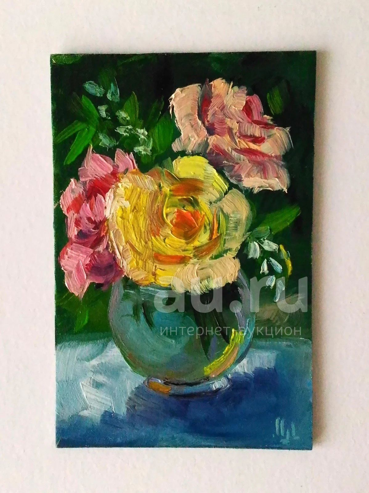 Картина маслом, Миниатюра, Желтые Розы, Букет, Живопись, 14 февраля, 8 марта, Подарок