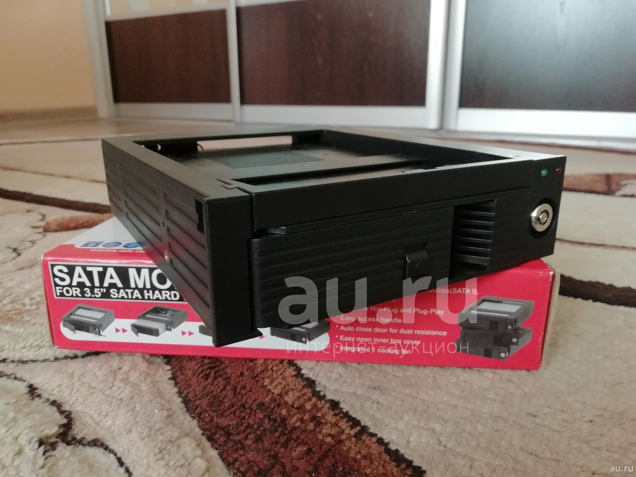 Салазки для HDD (mobil rack) черного цвета. Присутствуют вентилятор на задней стенке, охлаждающий винчестер, замок с 2 ключами и родная коробка. Устанавливается в любой 5.25 отсек системного блока.