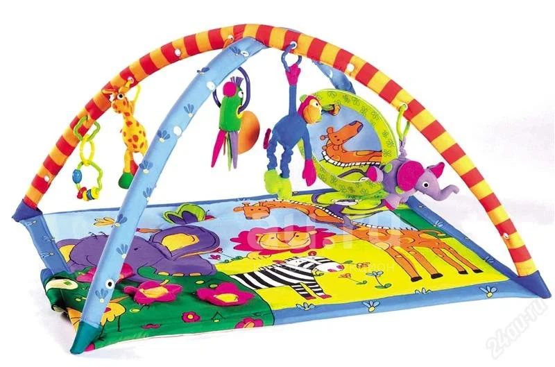 В коврике имеется музыкальный центр с двумя вариантами мелодий. После нажатия на центр коврика может без перерыва играть несколько мелодий в течение десяти минут. Второй вариант предусматривает звучание трех колыбельных песен. После того, как музыка закончится, стоит малышу нажать на центр коврика, она зазвучит вновь. Игрушки, которые висят на арке, стимулируют ребенка стучать по игрушкам ножками или ручками и хватать их. Тактильное восприятие и развитие мелкой моторики рук также стимулируется разнообразной и интересной структурой игрушек.