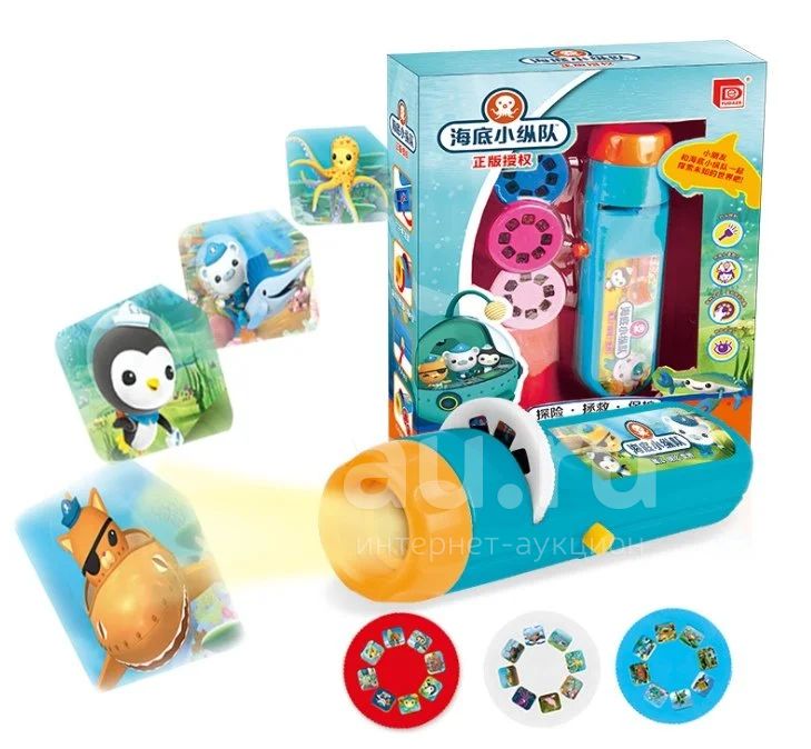Это волшебный фонарик с любимыми героями октонавтами. В наборе идет 3 диска, их нужно вставить в специальное отверстие и вы сможете увидеть мультик в картинках про любимых героев.