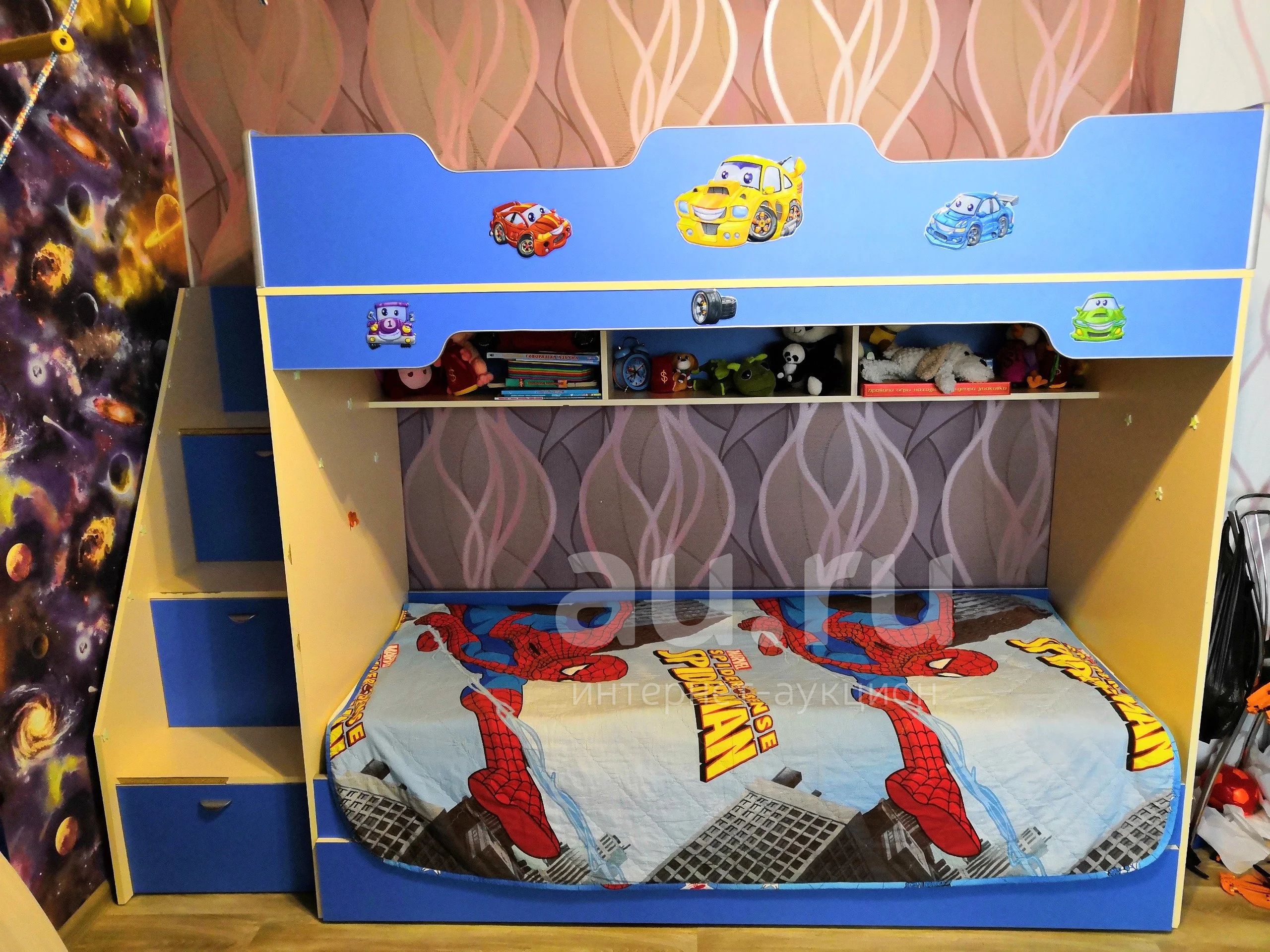 2-ярусная кровать с лестницей (в лестнице 3 выдвижных ящика, над нижней кроватью 3 полки, по кроватью выдвижной ящик. Два матраса продам вместе с кроватью. Шкаф для одежды: антресоль с двумя полками, внизу два выдвижных ящика, основной шкаф из двух половин - одна половина со штангой для плечиков, вторая половина с 4-мя полками. Стол письменный. Стеллаж: 3 открытые полки и 2 закрытые полки. Мебель б/у, кое-где есть сколы, но общий вид довольно приличный. Продаём, т.к. дети выросли, полностью меняем мебель в комнате.